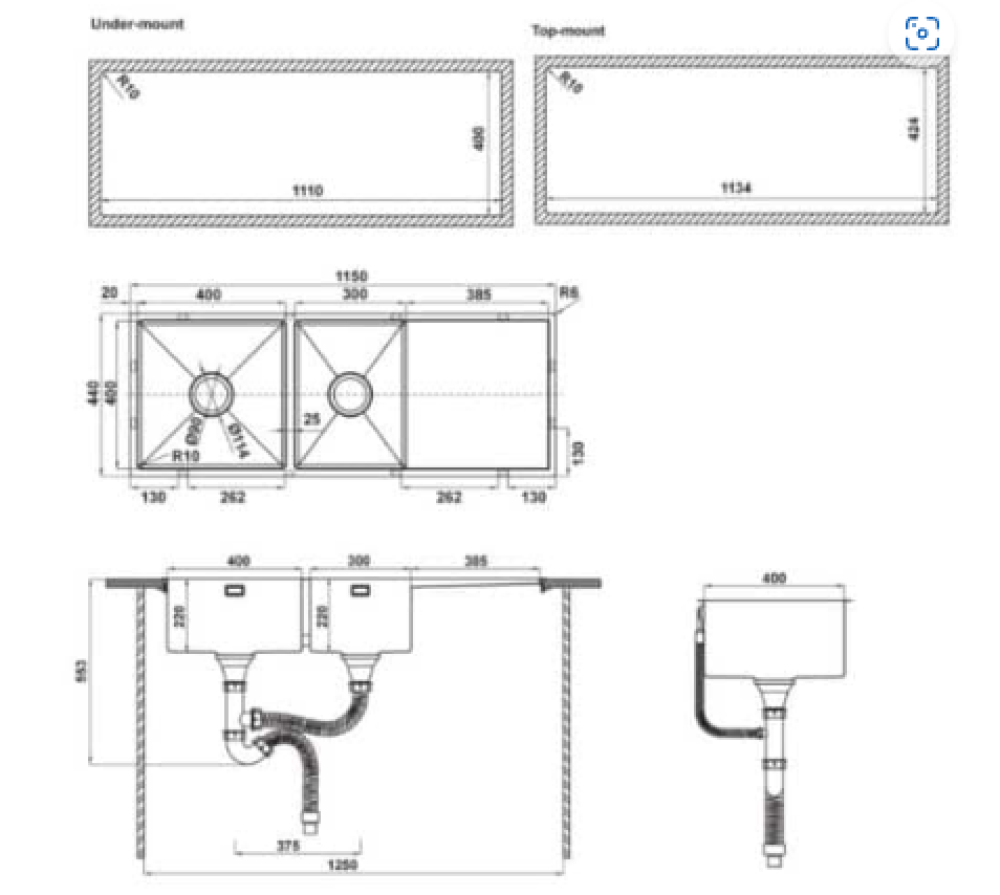 • Kích thước mỗi bồn: 400D x 400R mm / 300D x 400R mm