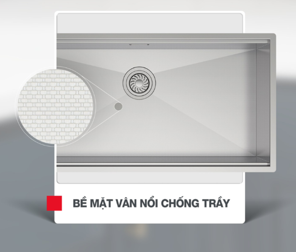 - Bề mặt vân nổi chống trầy : được ứng dụng công nghệ dập tạo các hạt vân nổi trải đều trên bề mặt chậu, hạn chế được tối đa các tác nhân gây trầy xước như bùi nhùi sắt, đồ dùng làm bếp va chạm khi thao tác