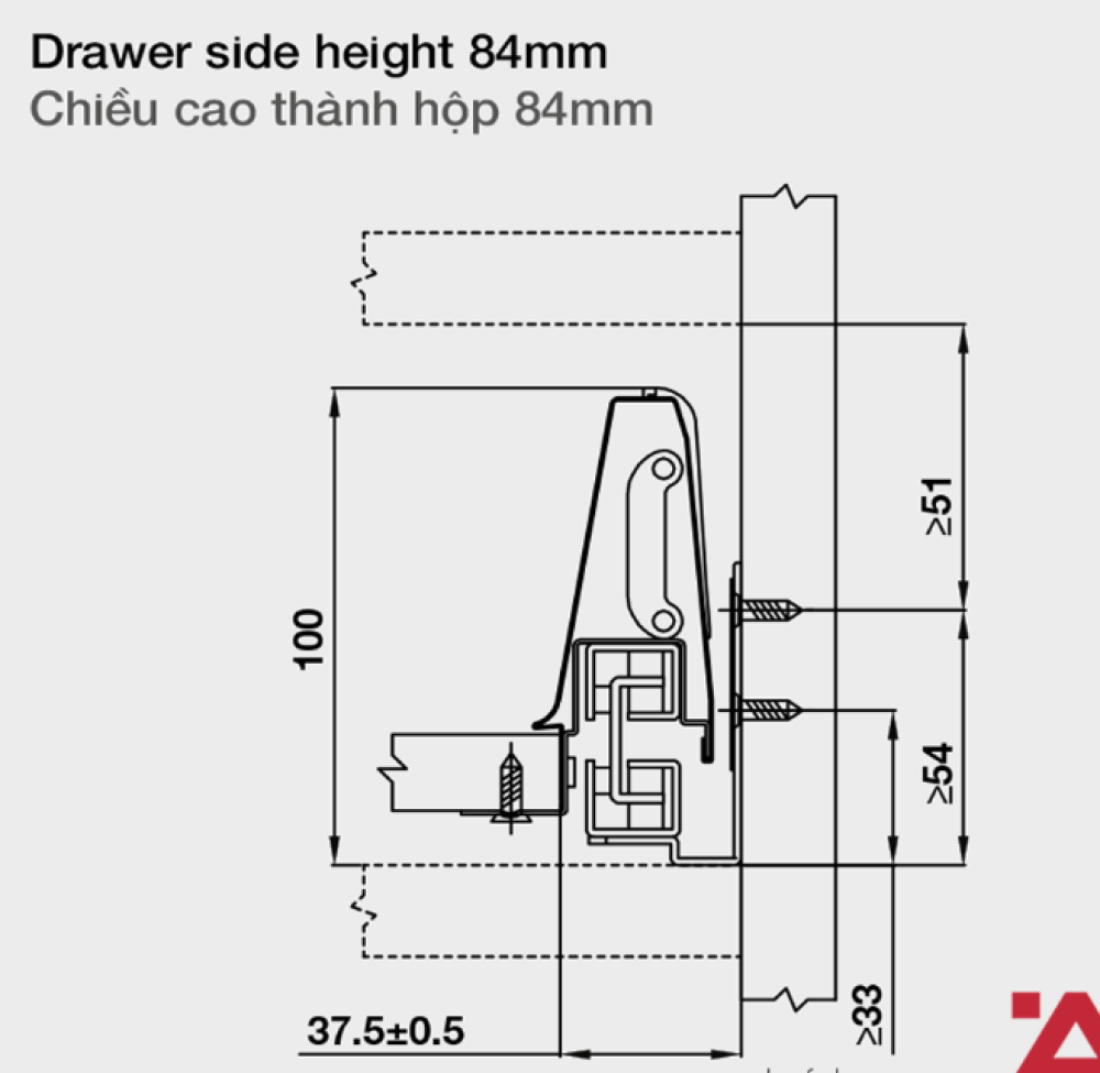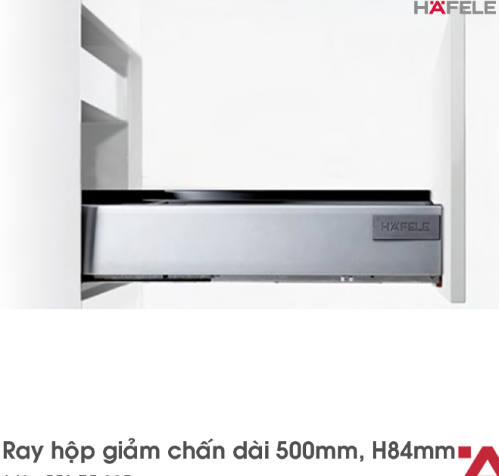 - Trọn bộ gồm : 1 cặp ray trượt mở toàn phần, 1 cặp thành hộp cao 84mm, 2 bas mặt sau, 2 bas mặt trước, 2 nắp che với logo Hafele